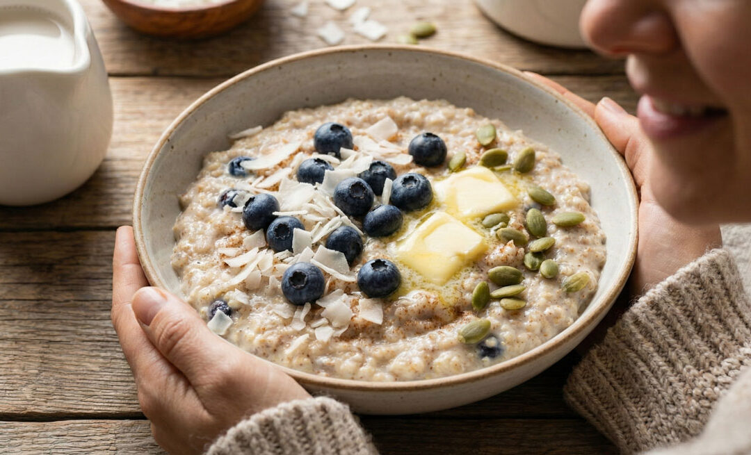 Low carb hot blueberry coconut cereal breakfast bowl with keto-friendly toppings like pumpkin seeds and almond milk.