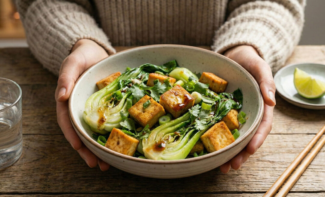 Bowl of crispy oven-baked tofu and bok choy salad tossed in spicy peanut dressing