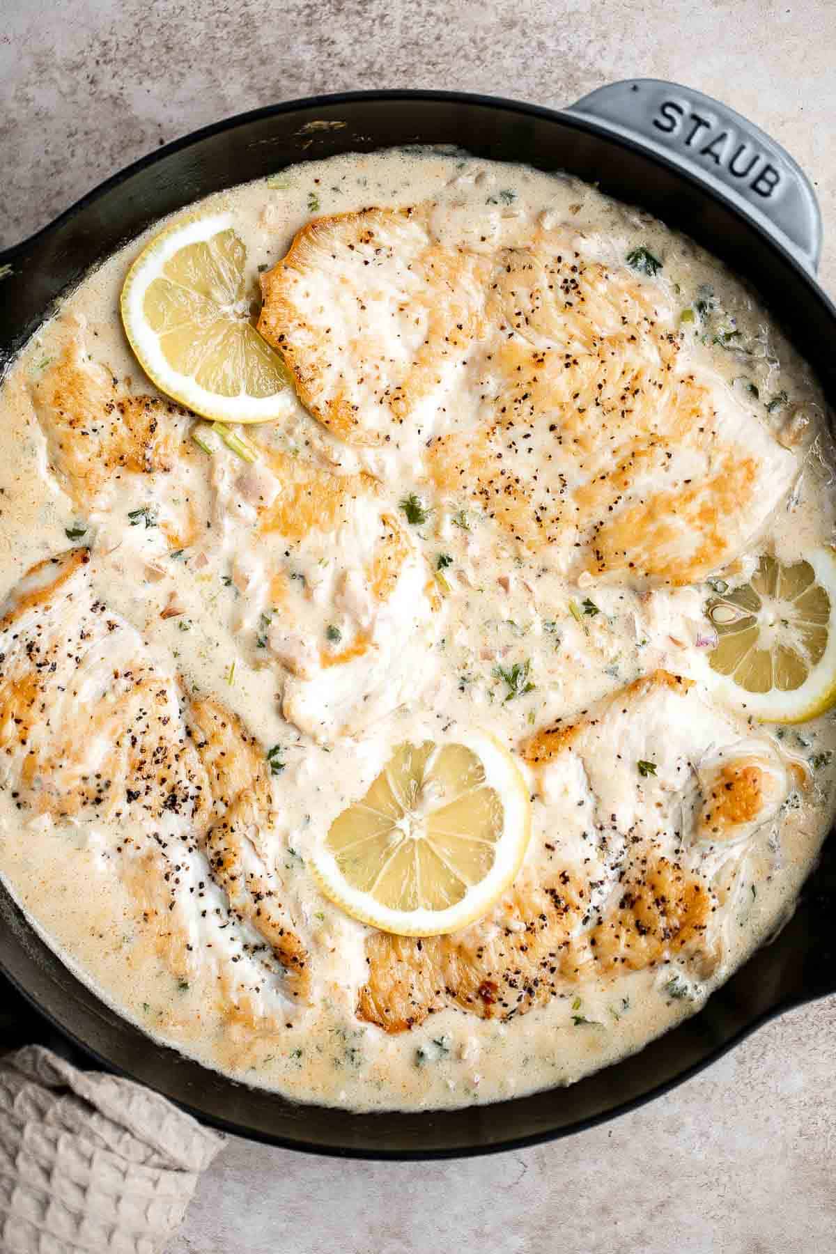 1. In a large cast iron skillet add 1 tablespoon of butter to melt on medium high heat. Add the kosher salt, black pepper and Italian seasoning to the chicken and add it to the pan.