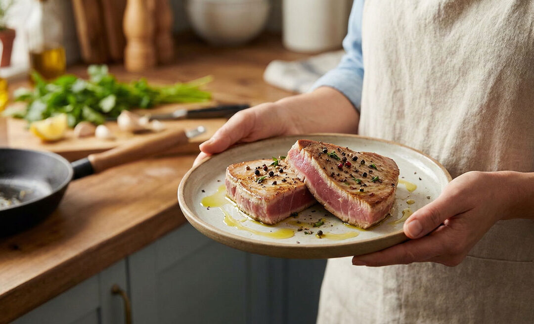 Woman wearing an apron holding a ceramic plate with two perfectly pan seared Ahi Tuna Steaks seasoned with paprika and whole peppercorns