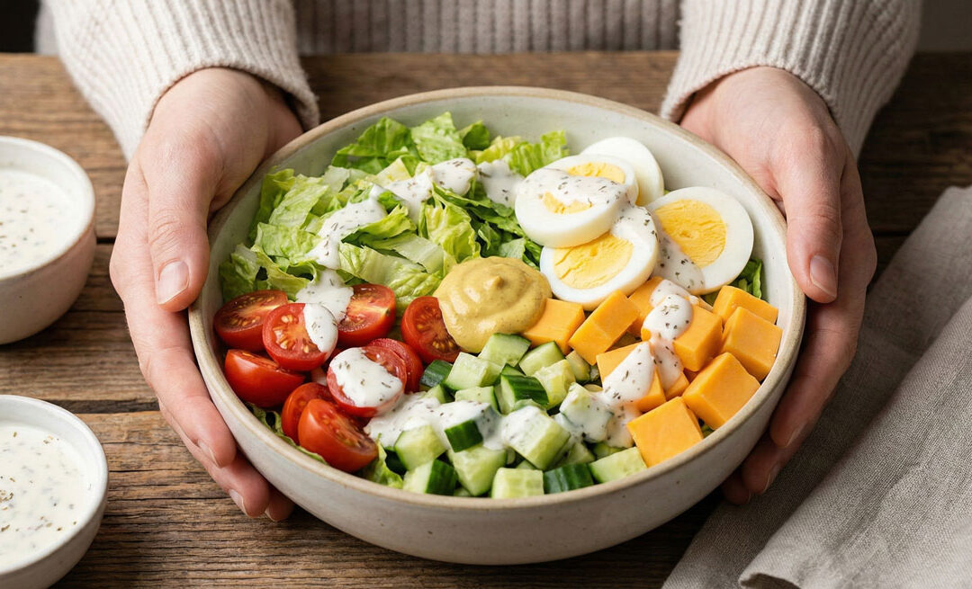 Woman holding a fresh Keto Club Salad bowl topped with hard boiled eggs cheddar cheese and creamy dressing