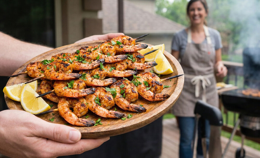 Woman holding a wooden platter of Grilled Spicy Shrimp garnished with fresh lemon wedges and herbs for a healthy seafood dinner